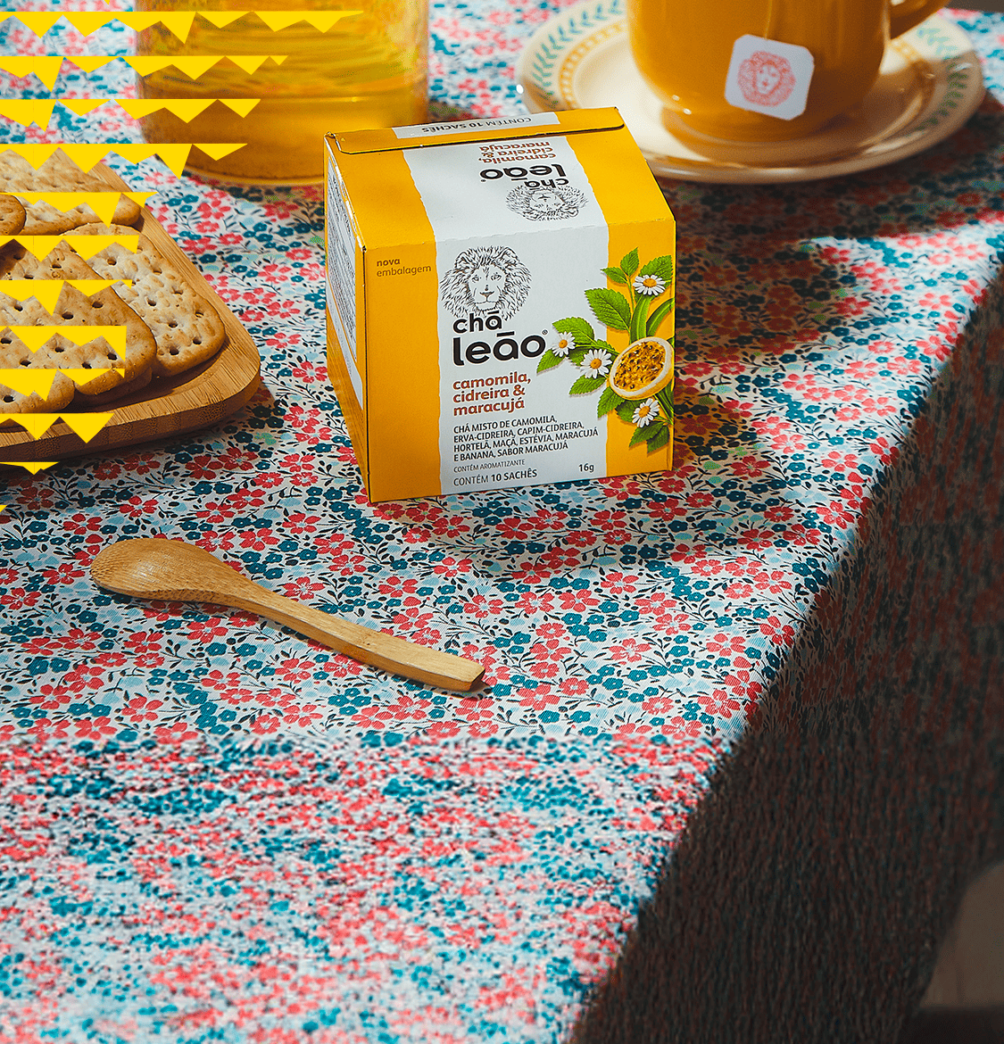 CAPÍTULOS FLORAIS DE CAMOMILA (Matricaria recutita L.) FOLHA E RAMOS DE ERVA-CIDREIRA (Cymbopagon citraus stapf), FOLHAS DE CAPIM-CIDREIRA (Cymbopogon citratus Stapf), FOLHAS E RAMOS DE HORTELÃ (menta piperita L.), FRUTO DE MAÇÃ (Pyrus malus L.), FOLHAS DE ESTÉVIA (Stevia rebaudiana Bert), POLPA DE FRUTA DE MARACUJÁ (Passiflora educius F. Flavicarpa Degener), AROMATIZANTE.